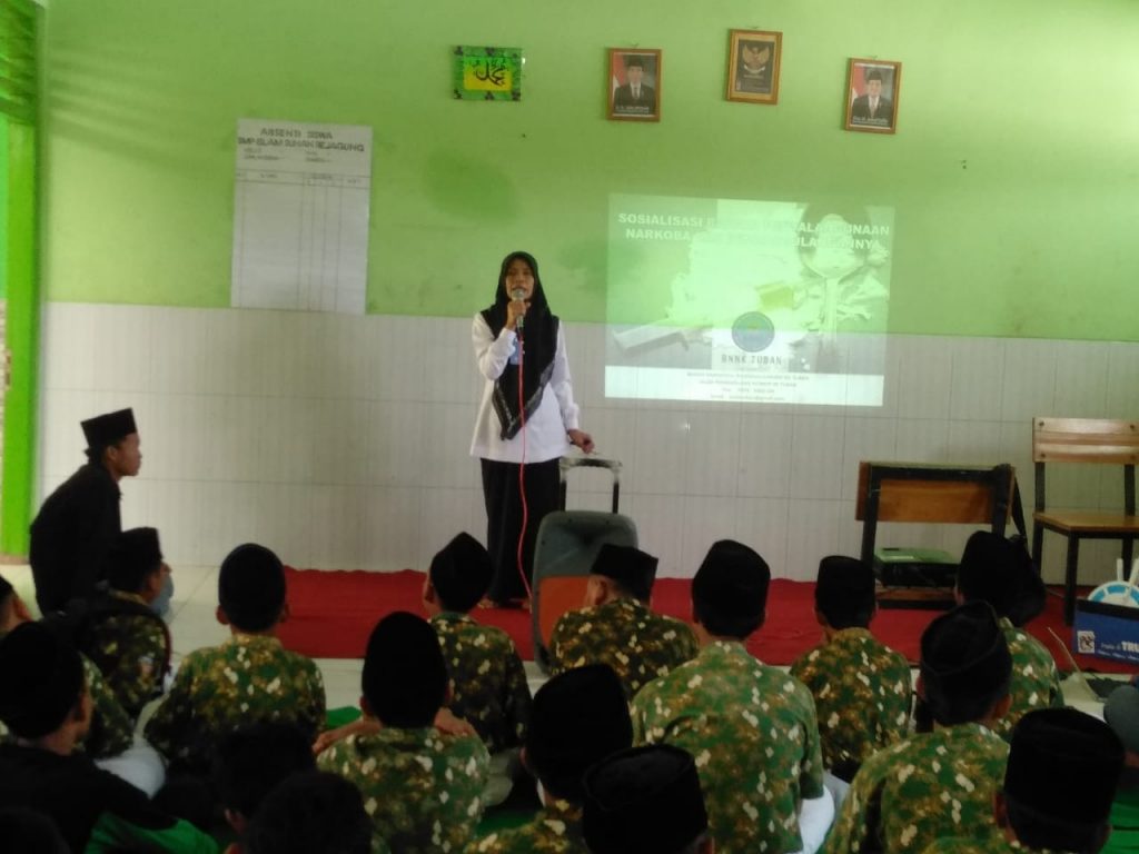 Badan Narkotika Nasional (BNN) kabupaten Tuban terus memerangi narkoba. Salah satunya melalui kegiatan sosialisasi / penyuluhan tentang bahaya penyalahgunaan narkoba di tingkat pelajar. Kali ini yang didatangi adalah SMP Islam Sunan Bejagung, yang beralamat di Desa Bejagung, Kecamatan Semanding, Kabupaten Tuban.